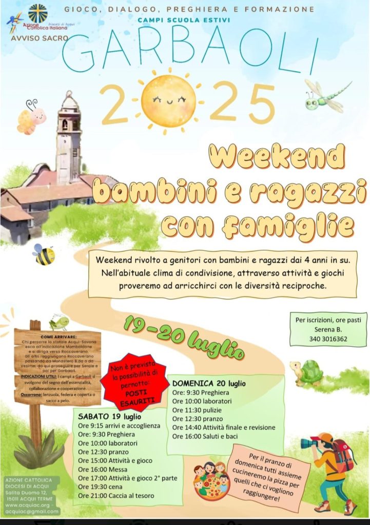 27 Giugno 202527 Giugno 202519 e 20 luglio a GARBAOLI week end bambini e ragazzi con famiglie condividi su