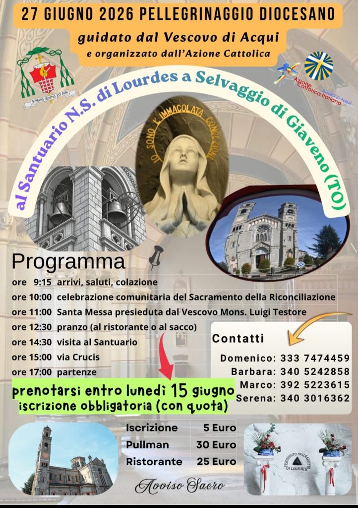 27 Aprile 202627 GIUGNO 2026 PELLEGRINAGGIO DIOCESANO guidato dal Vescovo di Acqui e organizzato dall’Azione Cattolica condividi su