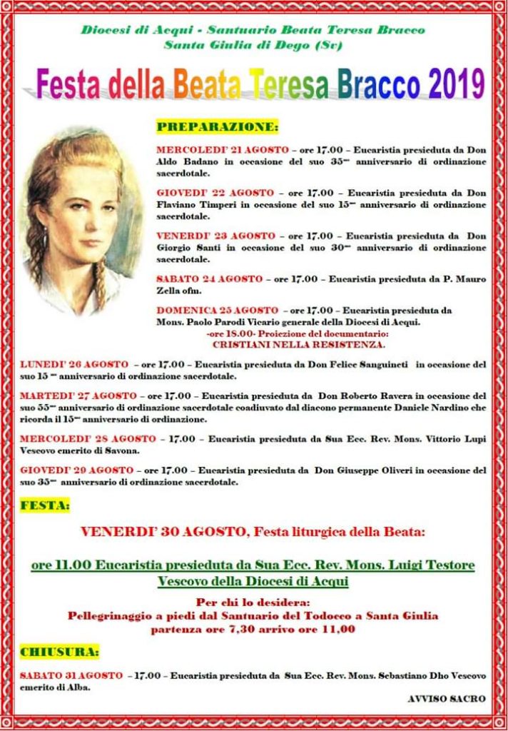 31 Luglio 20198 Settembre 2022Beata Teresa Bracco – Dal 21 al 31 agosto, calendario per la preparazione e la festa 2019 a Santa Giulia di Dego (Sv) condividi su