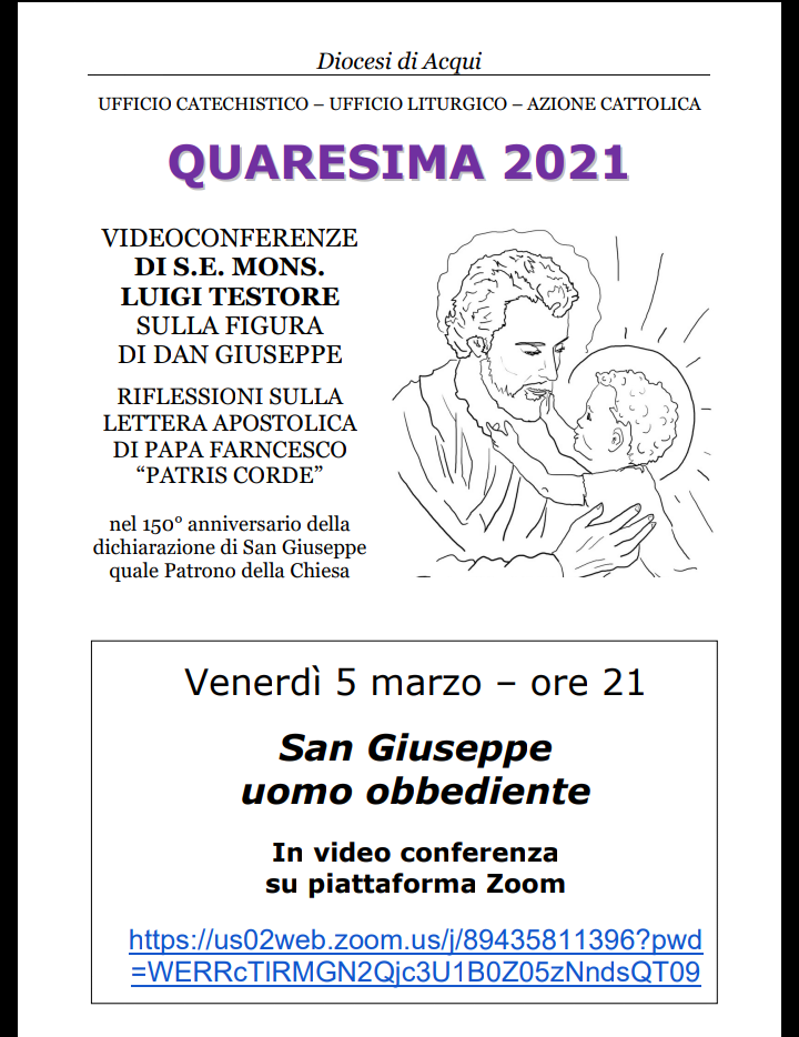 Sì segnala che per la catechesi di venerdì 5 marzo è stato ampliato il numero di partecipanti della piattaforma ZOOM fino a 500 per garantire a tutti la possibilità di partecipare.