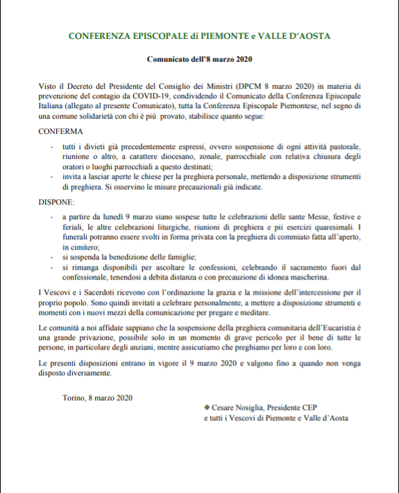 8 Marzo 20208 Settembre 2022CEP – Conferenza Episcopale del Piemonte e della Valle d’Aosta COMUNICATO DELL’ 8/3/2020 condividi su