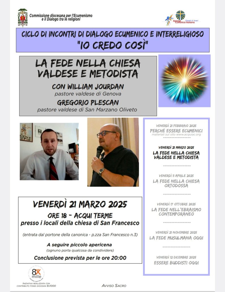 18 Marzo 2025CICLO DI INCONTRI dI DIALOGO ECUMENICO E INTERRELIGIOSO “io credo cosi” – LA FEDE NELLA CHIESA VALDESE E METODISTA condividi su
