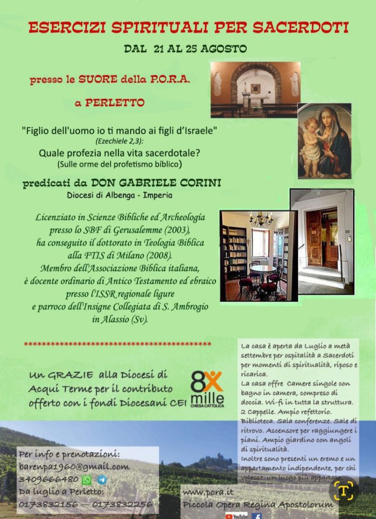 4 Agosto 2023con il contributo dei fondi diocesani CEI 8xMille per la Chiesa Cattolica Esercizi Spirituali per Sacerdotindal 21 al 25 agosto presso le suore della P.O.R.A. a Perletto condividi su