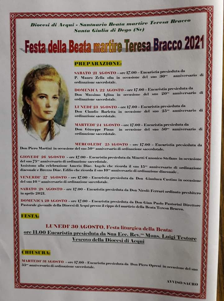 Inizia oggi la preparazione alla festa della beata Teresa Bracco