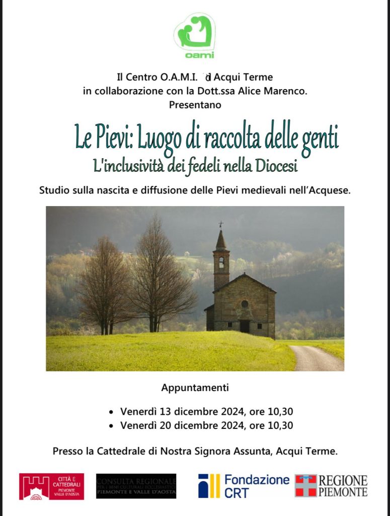 9 Dicembre 20249 Dicembre 2024Il Centro O.A.M.I. di Acqui Terme in collaborazione con la Dott.ssa Alice Marenco. Presentano le Pievi: luogo di raccolta delle genti. L’inclusività dei fedeli nella Diocesi. Studio sulla nascita e diffusione delle Pievi medievali nell’Acquese condividi su