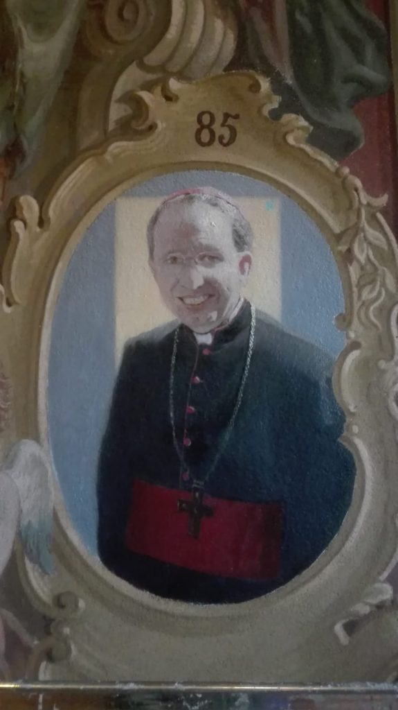 Il pittore Daniele Zenari ha concluso il ritratto del vescovo Pier Giorgio Micchiardi nell’ultimo spazio previsto nella prestigiosa sala di rappresenranza del palazzo vescovile. Una curiosa coincidenza: si conclude questa serie di vescovi con il primo vescovo del secondo millennio, ma anche l’ultimo proveniente dalla formazione nei seminari prima del Concilio Vaticano II.