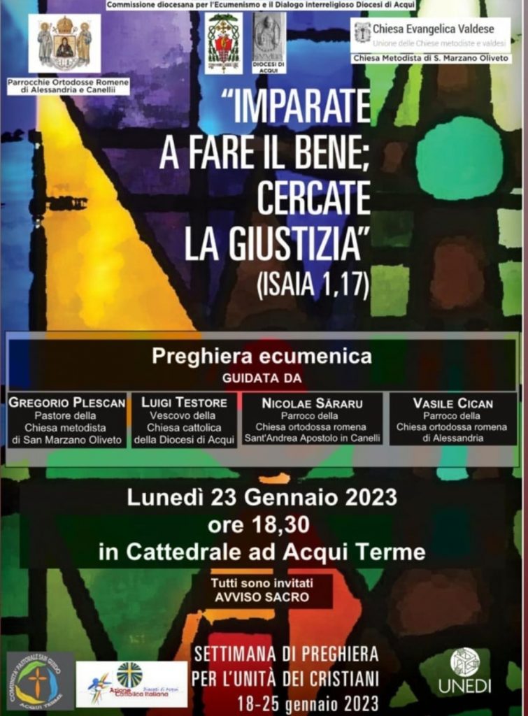 18 Gennaio 2023Preghiera ecumenica Imparate a fare il bene: cercate la giustizia >(Is 1, 17)Lunedì 23 gennaio, ore 18,30 in Cattedrale condividi su