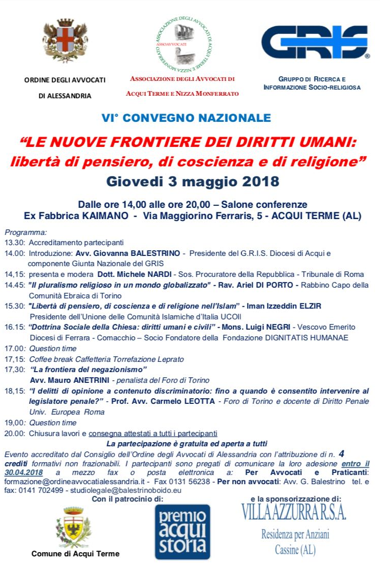 - “Le nuove frontiere dei diritti umani: libertà di pensiero, di coscienza e di religione“: VI° Convegno Nazionale, Giovedì 3 Maggio 2018, dalle ore 14:00 alle ore 20:00, salone conferenze Ex Fabbrica KAIMANO, Via Maggiorino Ferraris, 5, Acqui Terme (AL).
