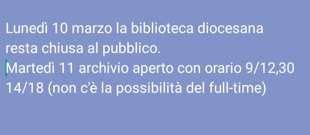 Lunedì 10 marzo la biblioteca diocesana resta chiusa al pubblico. Martedì 11 archivio aperto con orario 9/12,30  14/18