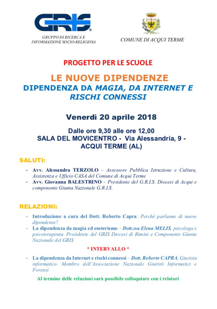- “Le nuove dipendenze: dipendenza da magia, da Internet e rischi connessi“: progetto per le scuole, Venerdì 20 Aprile 2018, dalle ore 09:30 alle 12:00, presso la sala del Movicentro, Via Alessandria 9, Acqui Terme (AL);