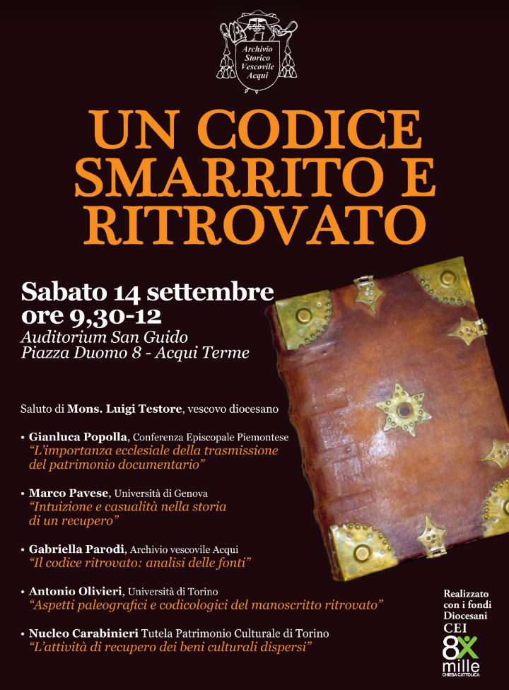 8 Settembre 20198 Settembre 2022Sabato 14 settembre all’Auditorium San Guido in Acqui Terme dalle ore 9,30 alle ore 12,00: “Un codice smarrito e ritrovato” – evento organizzato con il contributo dei fondi diocesani CEI dell’8xMille per la Chiesa Cattolica condividi su