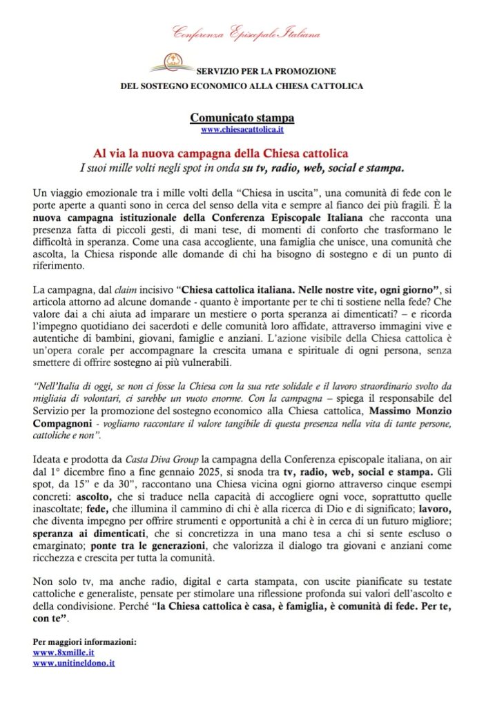 3 Dicembre 2024SERVIZIO PER LA PROMOZIONE DEL SOSTEGNO ECONOMICO ALLA CHIESA CATTOLICA Comunicato stampa www.chiesacattolica.it Al via la nuova campagna della Chiesa cattolica condividi su